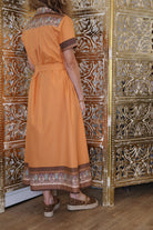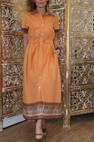 The Helen shirt dress designed to carry you through relaxed days in the city and effortlessly dressed-up luncheons. Comfortable yet refined we love styling it with a brown belt for a more contrasted look. Wear it with heels for an elevated feel or pair it with raffia espadrilles, some brown suede boots for an easy, chic daytime silhouette. The Helen orange print blends beautifully with brown and beige accessories, making it a versatile and timeless piece in your wardrobe. It comes in size STD and fits XS-XL.