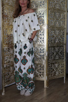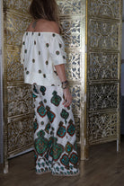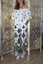 The Magic off shoulder top is designed to pair beautifully with its matching printed pants creating an effortlessly coordinated look. It can just as easily be styled with jeans, khaki or beige pants for a more relaxed, everyday feel. The print blends perfectly with earth-tone accessories—suede leather, brown, beige, and all camel tones are simply divine to complement it. The shirt comes in STD size and fits XS-XL.