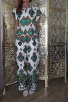 The Magic sleeveless shirt is designed to pair beautifully with its matching printed pants creating an effortlessly coordinated look. It can just as easily be styled with jeans, khaki or beige pants for a more relaxed, everyday feel. The print blends perfectly with earth-tone accessories—suede leather, brown, beige, and all camel tones are simply divine to complement it. The shirt comes in STD size and fits XS-XL.