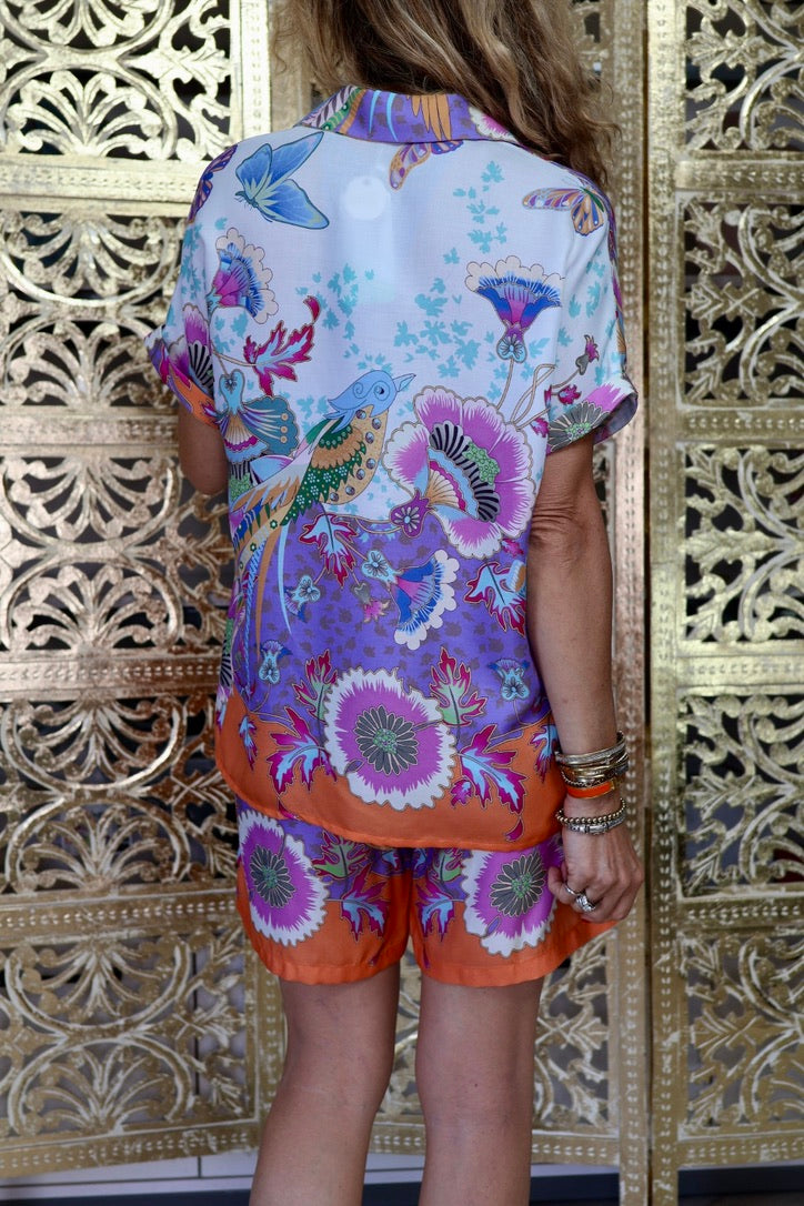 Immerse yourself in the luxurious comfort of our beatiful short sleeve Violet shirt.  With a relaxed fit throughout the body that falls to a hip-length hemline, this shirt exudes effortless style and wearability. Classic button detailing adds a touch of sophistication. Elevate your look by pairing this gorgeous shirt with matching print drawstring pants. Its versatile style allows for endless mixing and matching, providing countless styling options. Crafted from our new signature fabric, Tencel City Chic,  available in sizes 1 and 2, with Size 1 fitting XS-S and Size 2 fitting M-L.